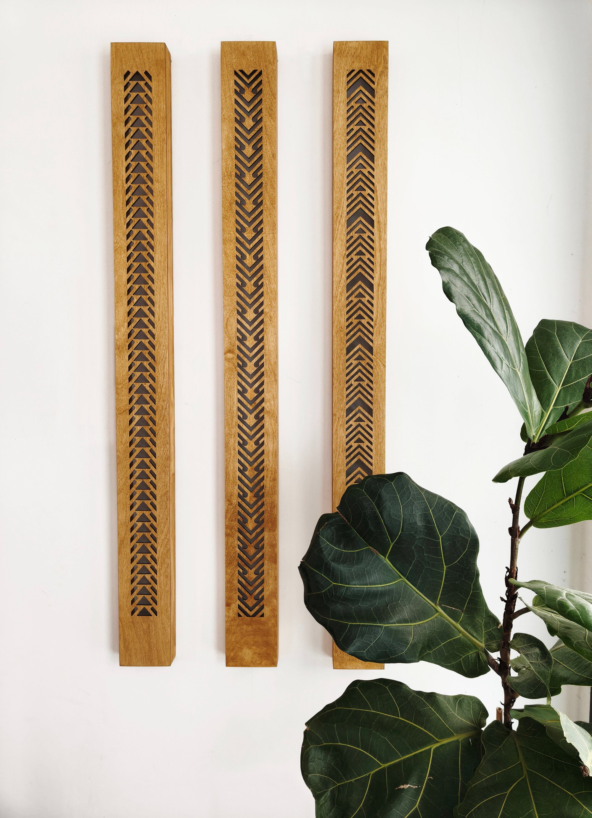 My latest series, 'Pillars', introduces a new medium of wall art and sculpture that continues my exploration of light, energy, and balance. Each sculpture in the 'Pillars' collection represents a significant person or experience in my life, acknowledging those who have supported me on my journey ~ both personally and as an artist. Central to the series are motifs such as the shark tooth from Fijian tapa, symbolic of my son’s Pacific heritage—representing strength, protection, and guidance. All of my works incorporate the triangle, which represents cultural depth and spiritual grounding.